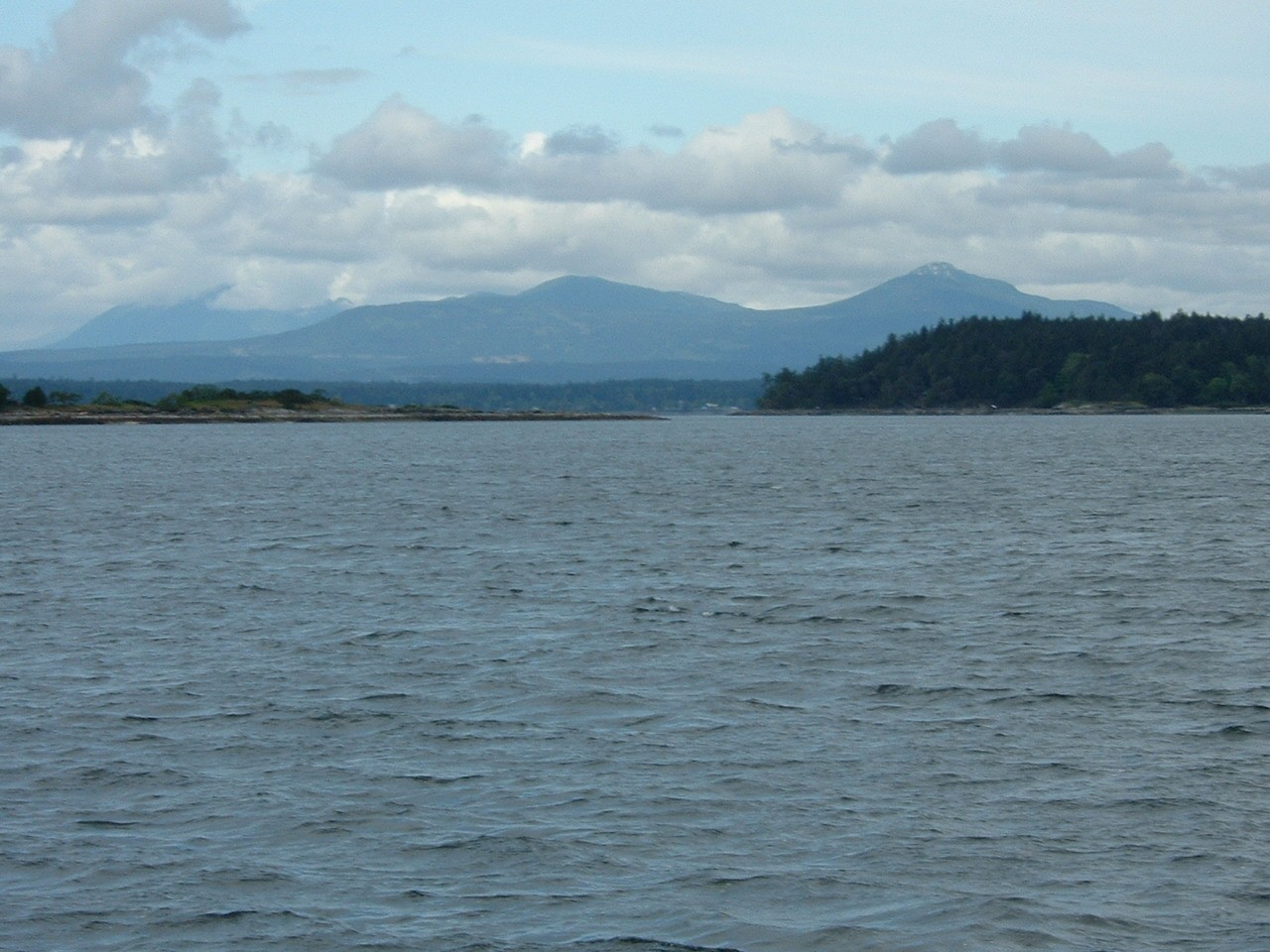 A view of Thetis Island from the north. As suggested by the contour lines on the chart, the peaks of Moore Hill and Burchill Hill are quite prominent when viewed from this direction.